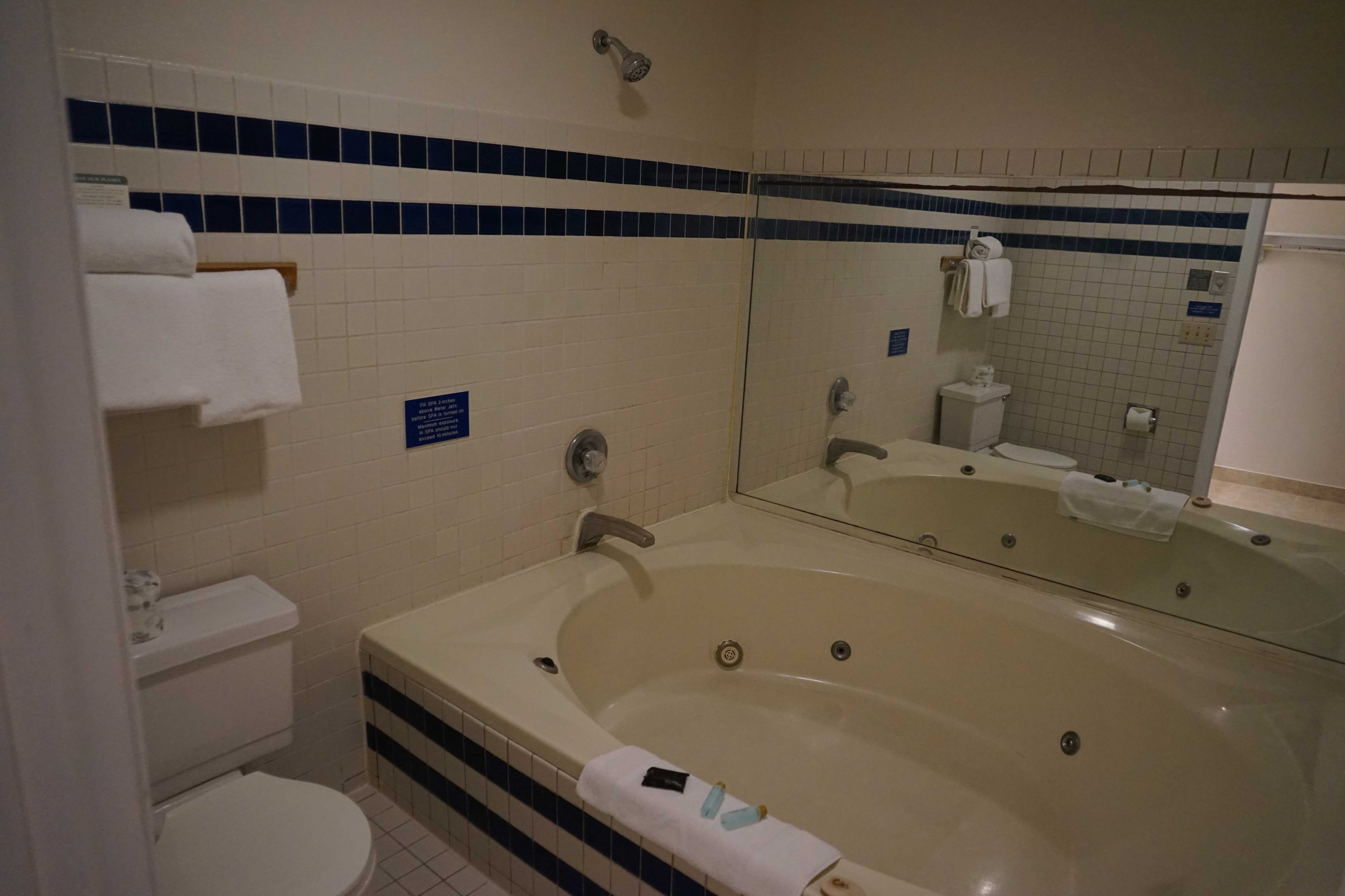 Fully upgraded Jacuzzi Suite with One King Bed. Huge Jacuzzi tub. Modern granite top vanity area. Suite is furnished with a Sitting Area, High Speed Internet Access, Microwave, Refrigerator, Coffee Maker, HBO Channels, Hair Dryer, Iron, Complimentary Local Calls, Voicemail and Writing Desk. Free continental breakfast is included.